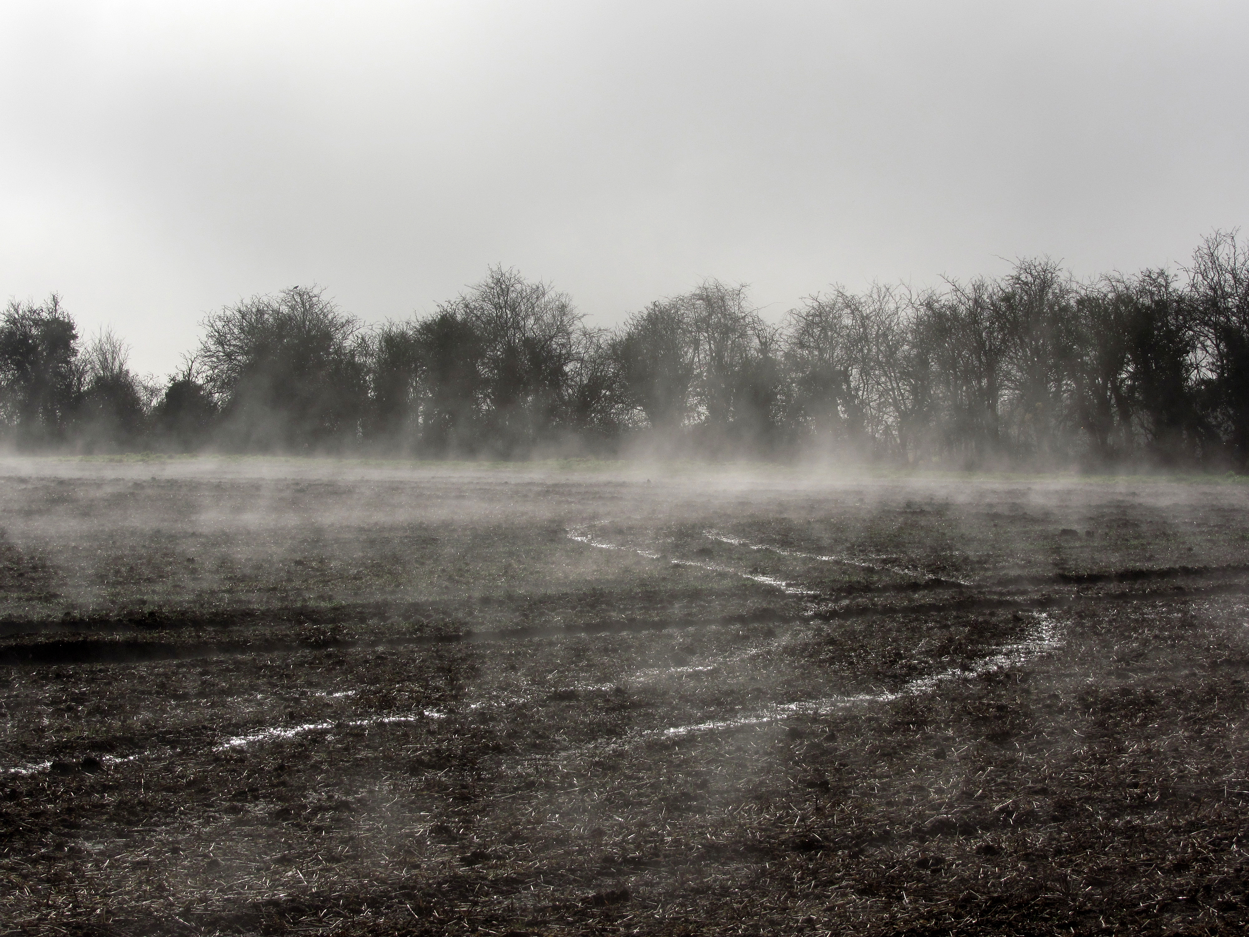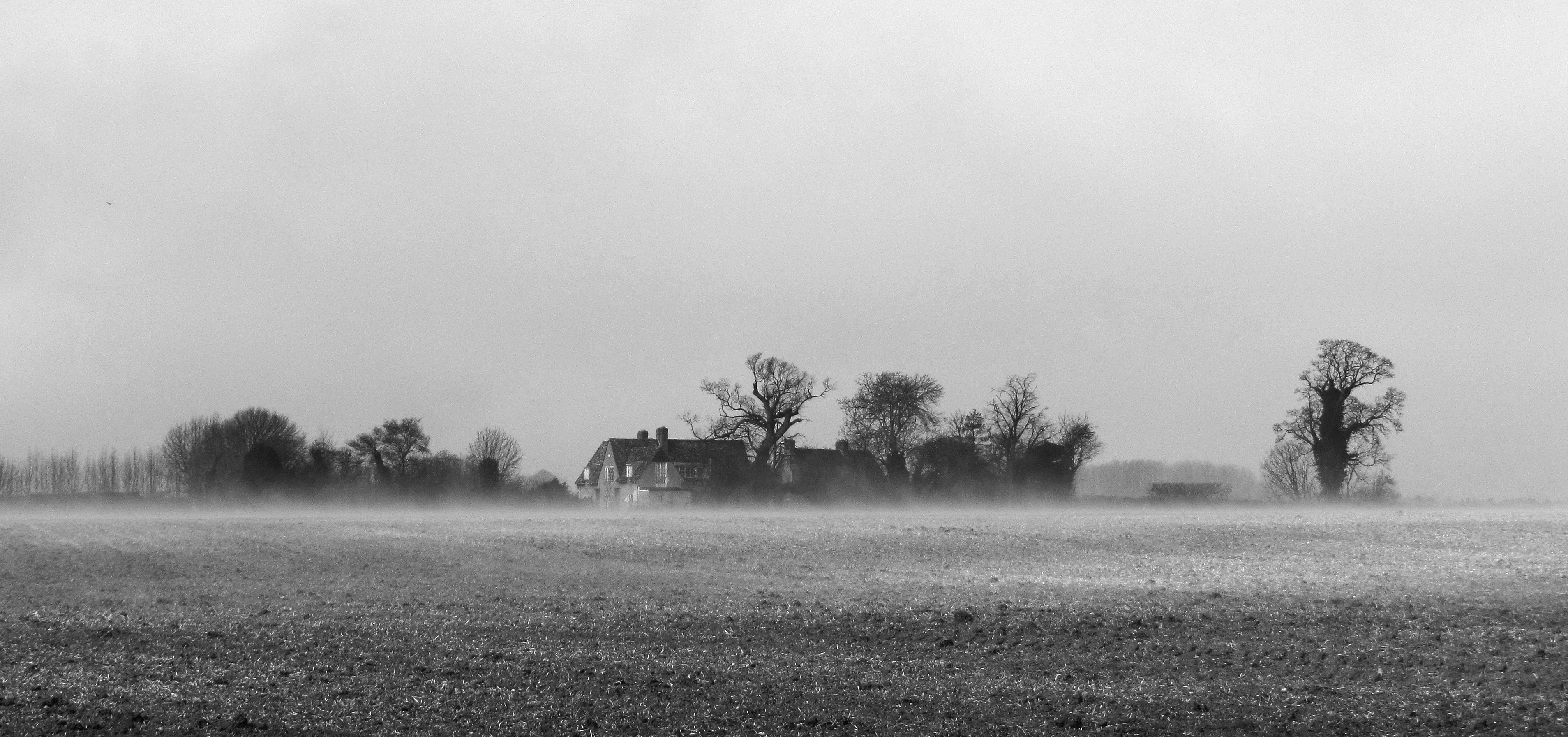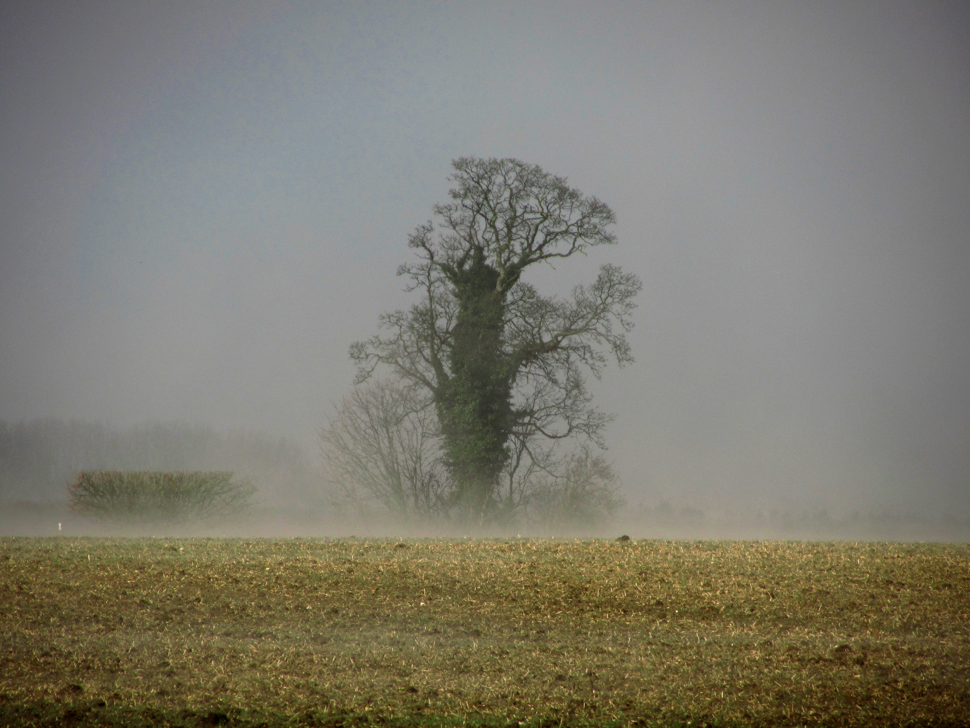 Mist rising off the damp dark fields at the front of our cottage this morning. Not river mist, but fine wraithlike tendrils of mist rising from the strength of the sun on the damp earth. Not easy to photograph, but a fine sight, telling of the increasing power of the sun, and the waning of winter. The monochrome drama of the drifting white mist over the raw, inert black earth holds my attention for some time. Then my eye is drawn to a lonely farmstead on the horizon, with its guardian oak. The day is widening, and hazy blue skies are promised.