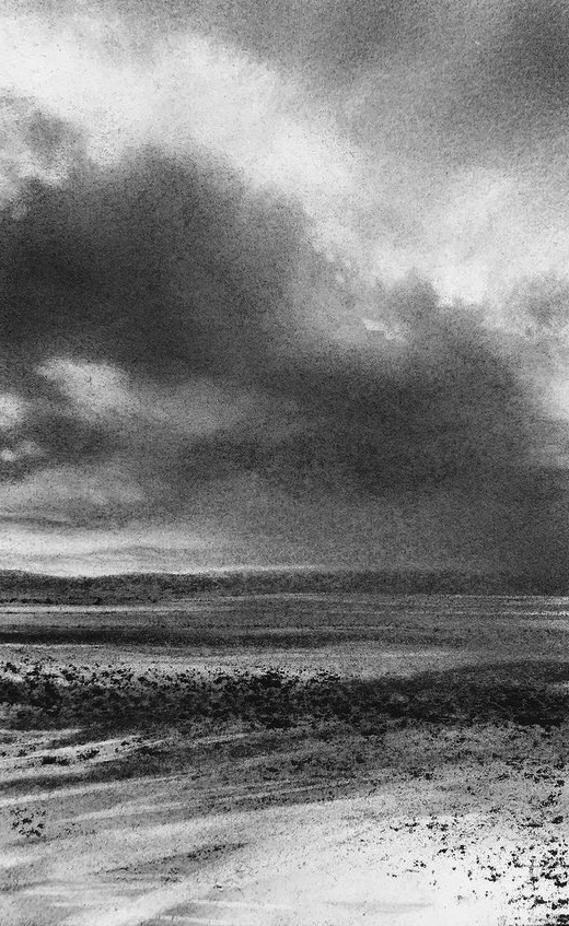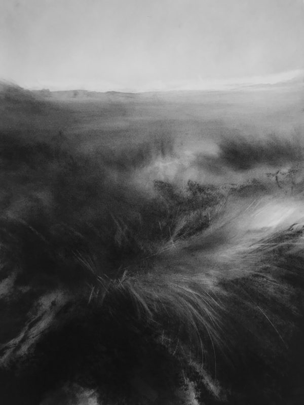 Kate Boucher uses charcoal to evoke liminal transition zones, skies at dawn and dusk, coasts and mountains in shifting atmospheres of wind and cloudscape. Each of her landscapes is an intense study of a particular mood, not a portrait of one moment or scene, but a response to the essential qualities inherent in a time and place based in many different angles of engagement. These studies arise from a deeply sensitive awareness of the emotional energies evoked by wide open landscapes. The working with soft layers of charcoal, with many stages of rubbing and melding results in a subtle and fluid interplay of form and movement.