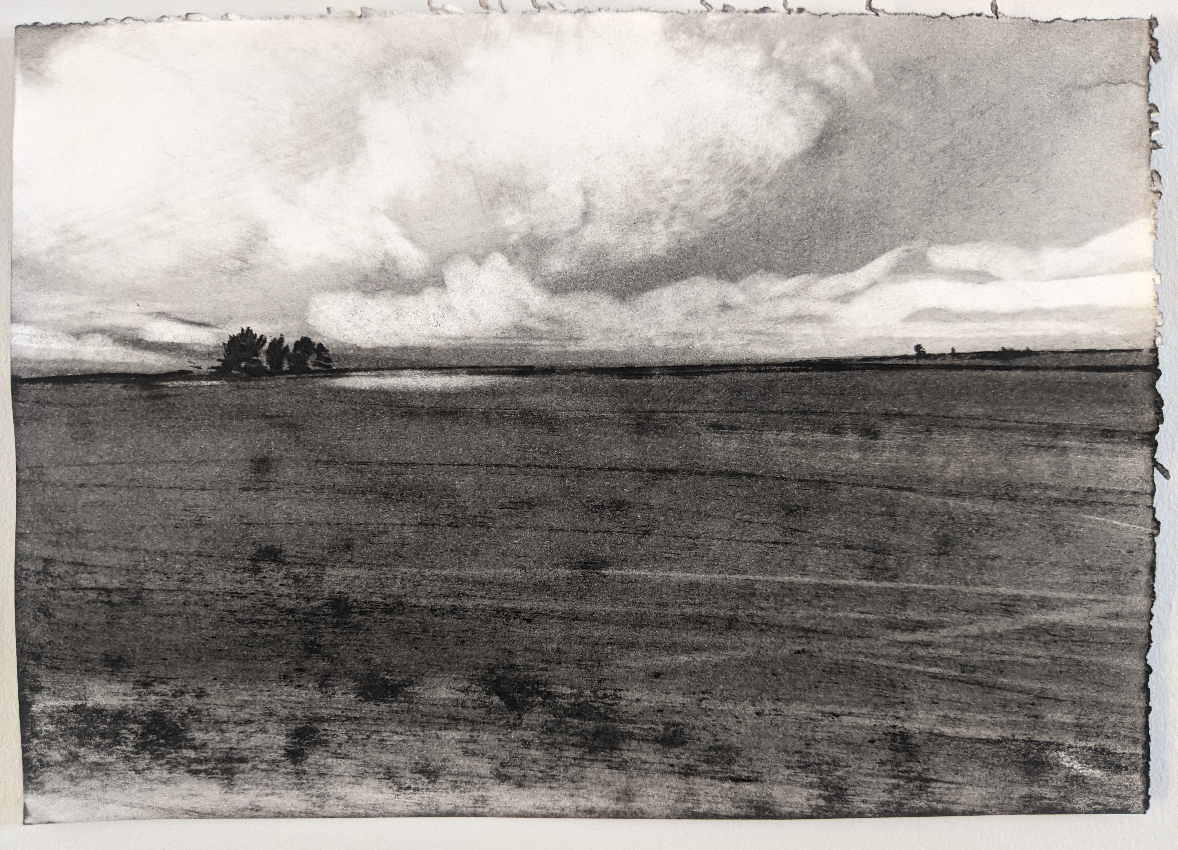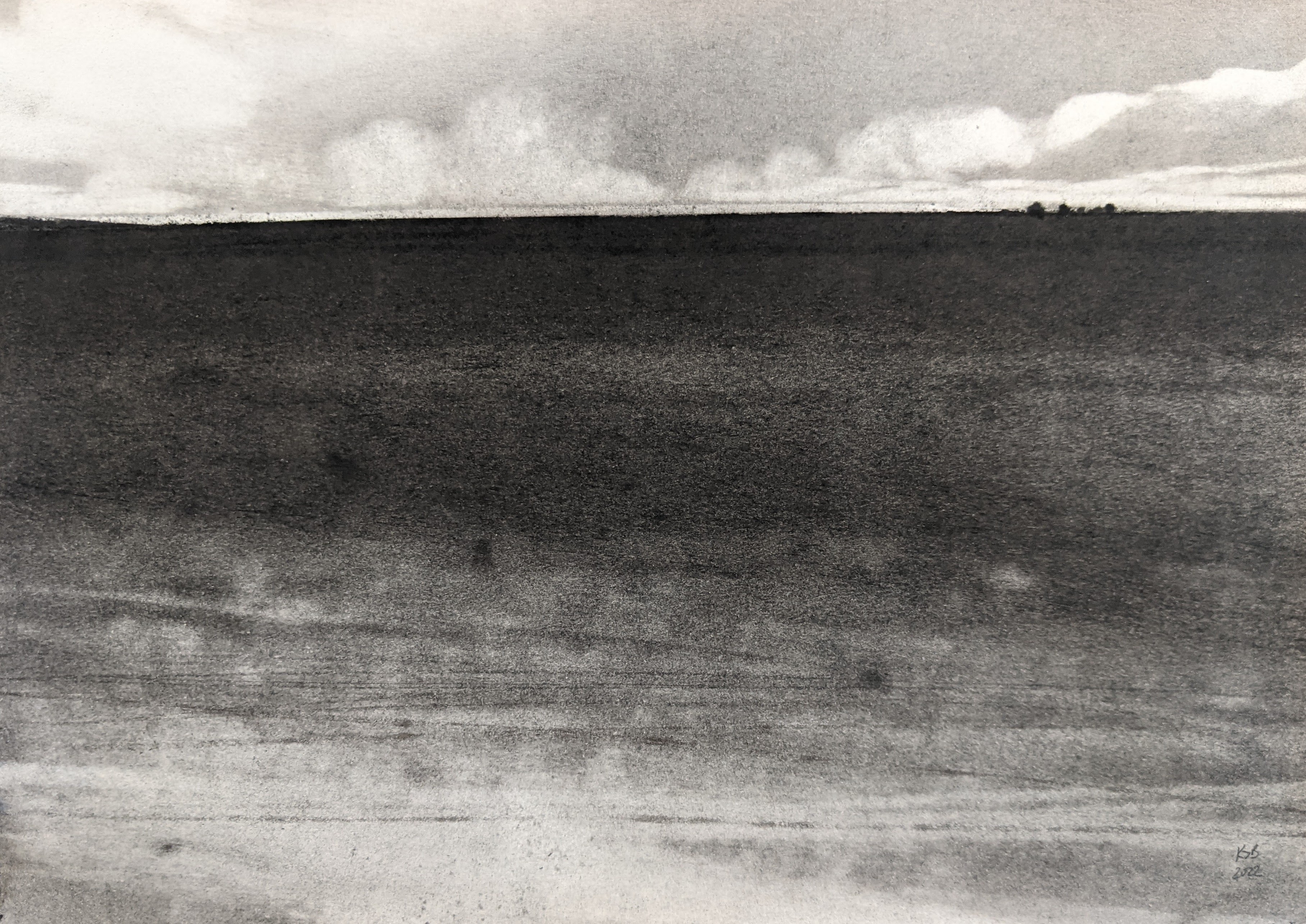 Kate Boucher uses charcoal to evoke liminal transition zones, skies at dawn and dusk, coasts and mountains in shifting atmospheres of wind and cloudscape. Each of her landscapes is an intense study of a particular mood, not a portrait of one moment or scene, but a response to the essential qualities inherent in a time and place based in many different angles of engagement. These studies arise from a deeply sensitive awareness of the emotional energies evoked by wide open landscapes. The working with soft layers of charcoal, with many stages of rubbing and melding results in a subtle and fluid interplay of form and movement.