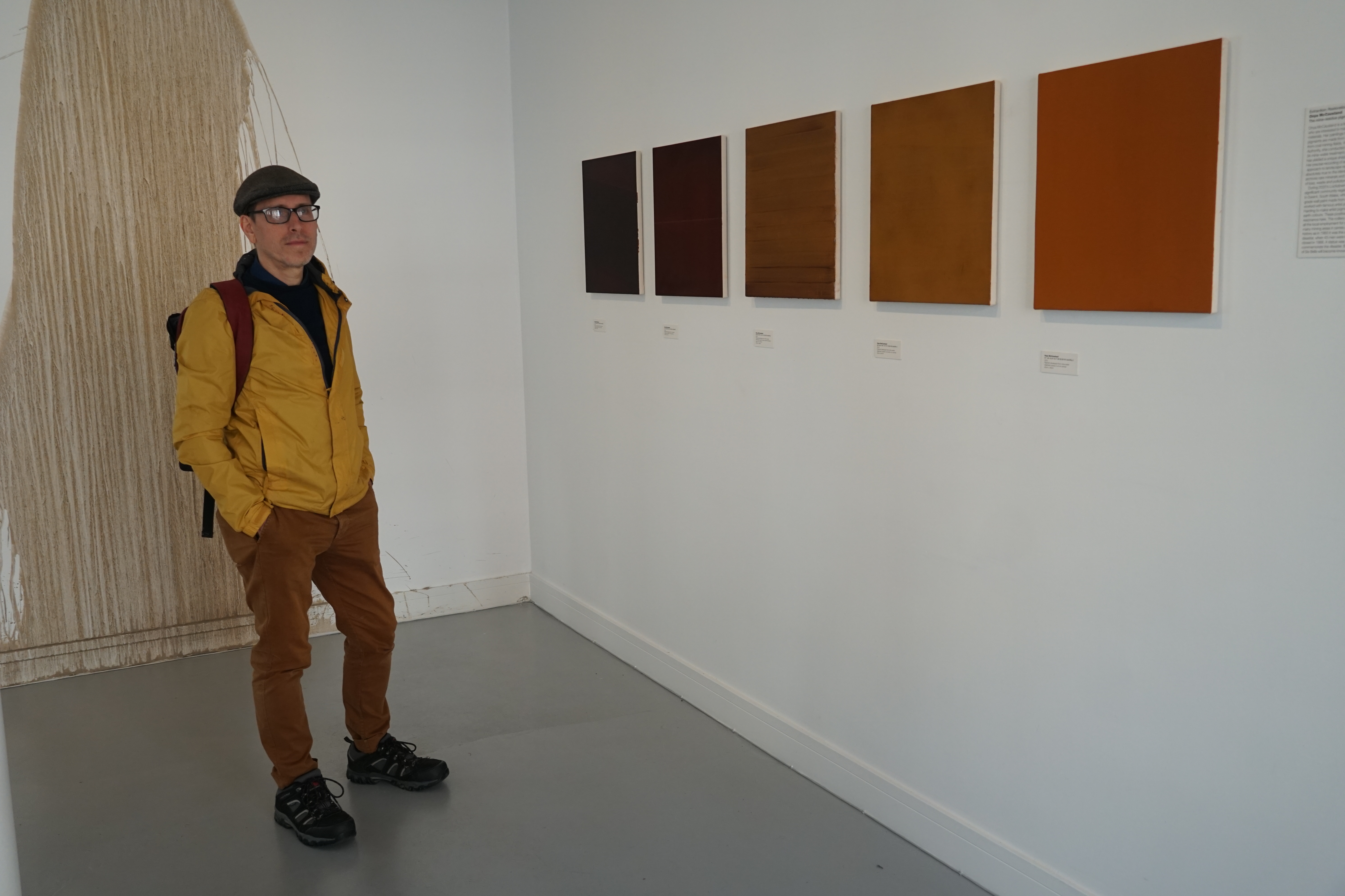 Featured here from the exhibition work by Onya McCausland showing a series of paintings making use of pigments created from mineral residues generated from the processes of mine water treatment. These wonderful ochre shades have been used to create subtle and evocative abstract pieces. And they matched my raincoat rather well!