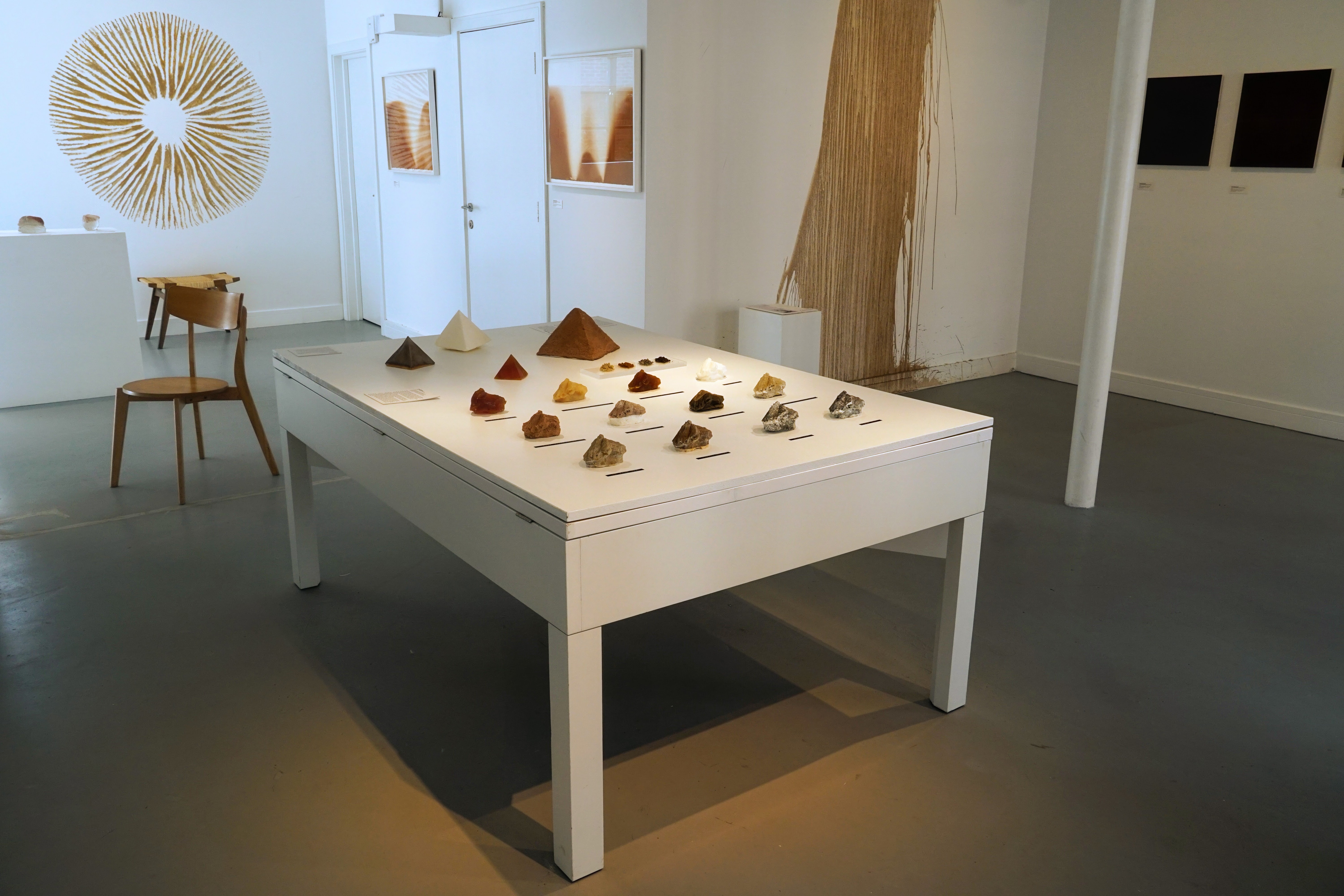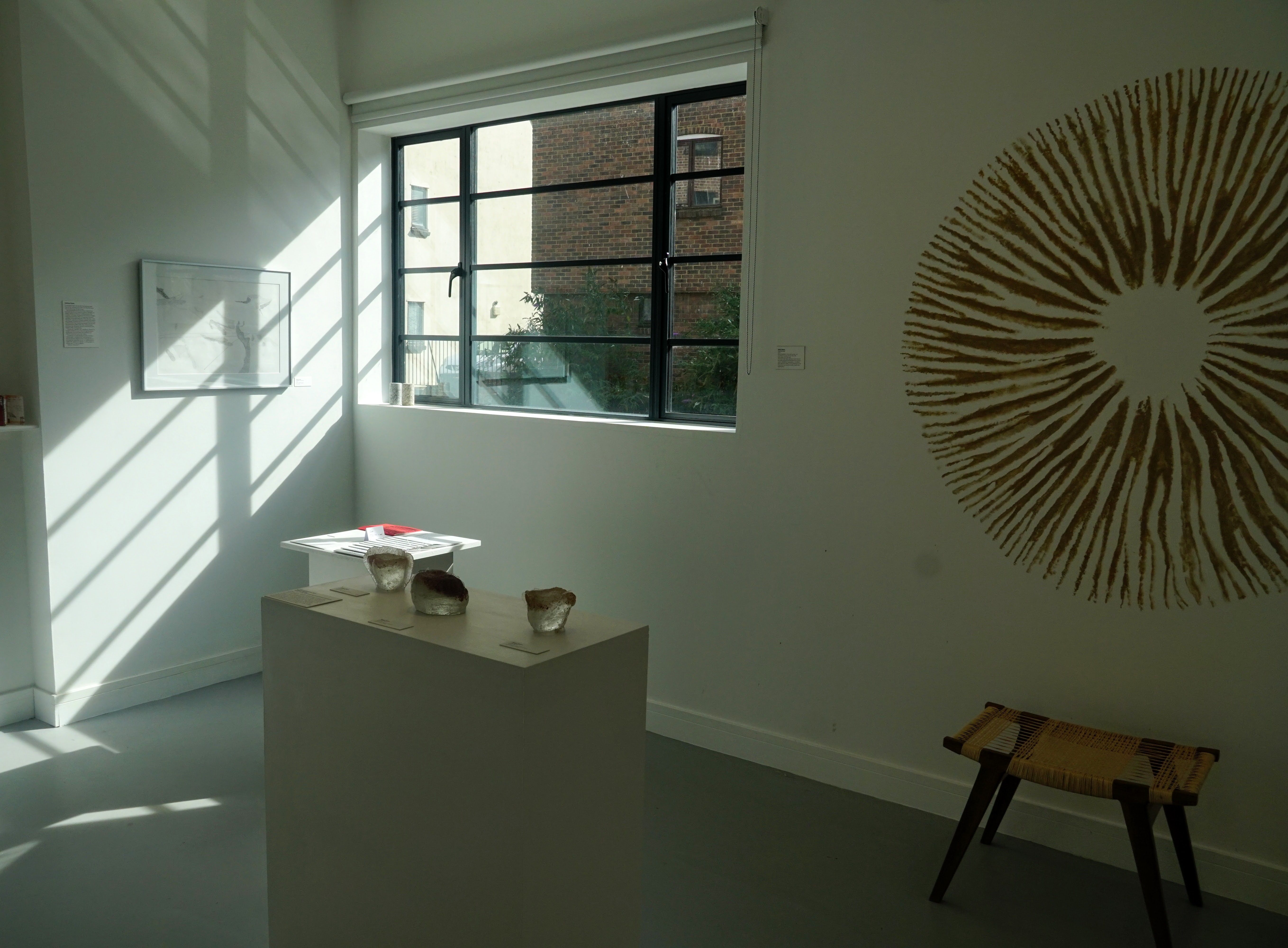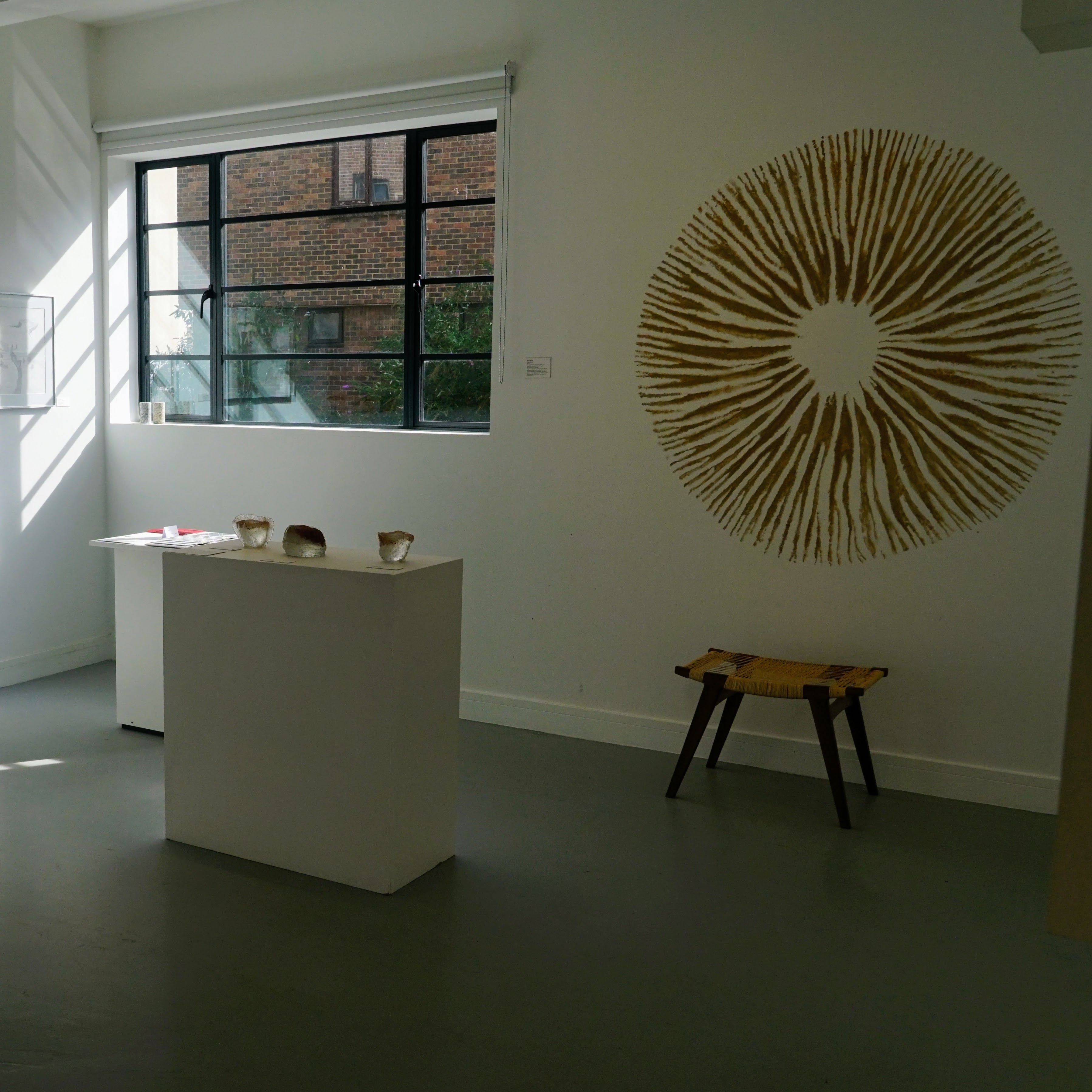 The large mycelium painting one the wall of the gallery is by Chris Drury: ‘Dust to Dust’ 2021. Mural painted in dust and ashes of a mushroom spore print on the wall. Painted in situ for GroundWork gallery by the artist using silt residue rom a local quarry, Middleton Aggregates.